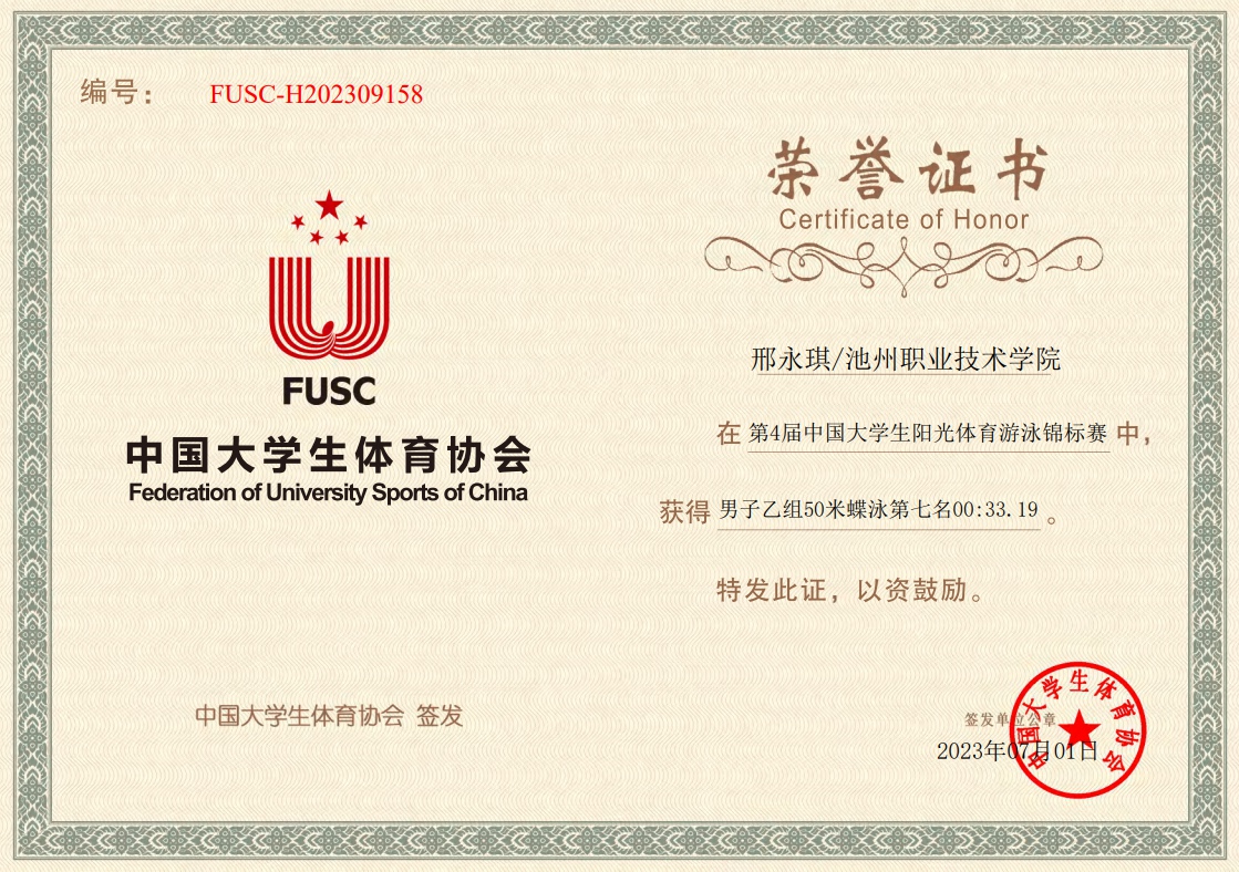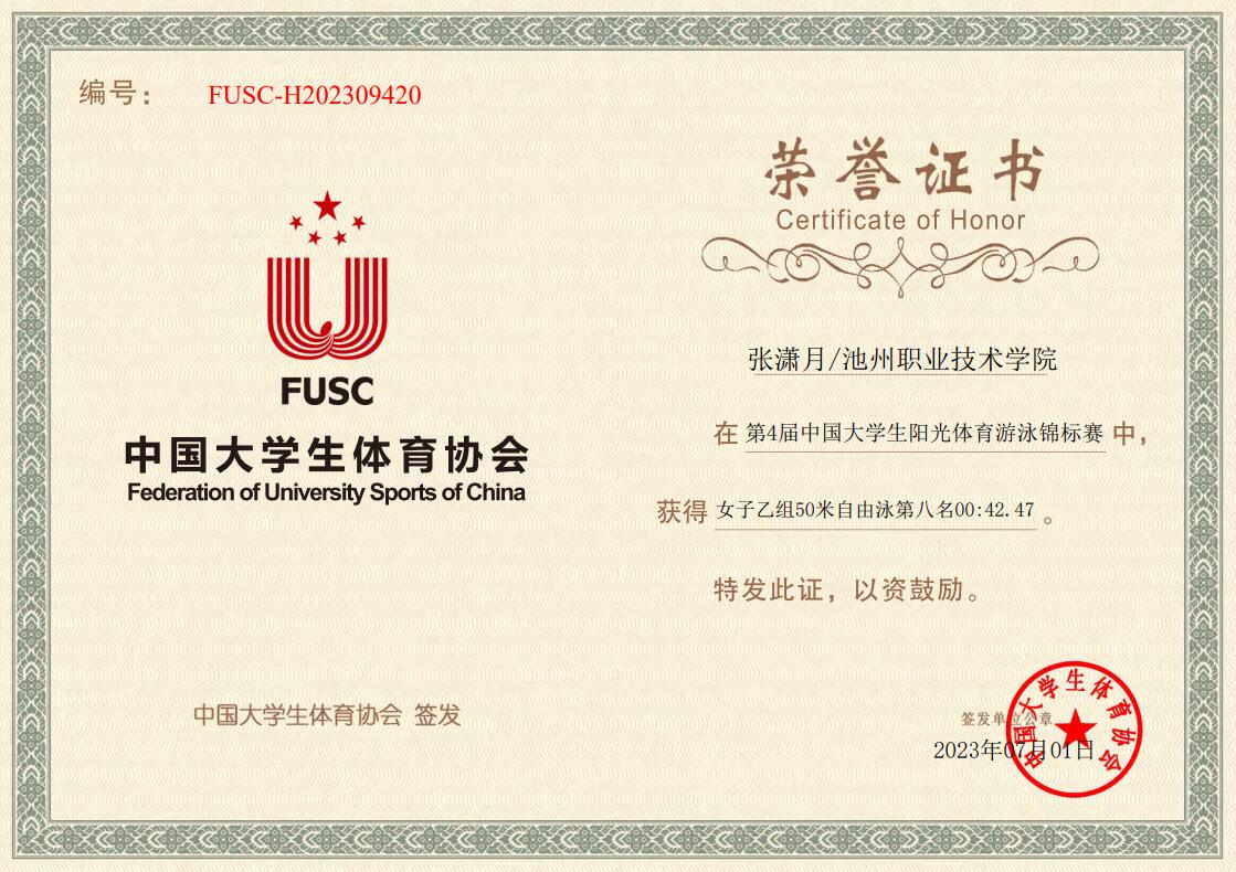 第4届中国大学生阳光体育游泳锦标赛池州职业技术学院代表队获奖证书